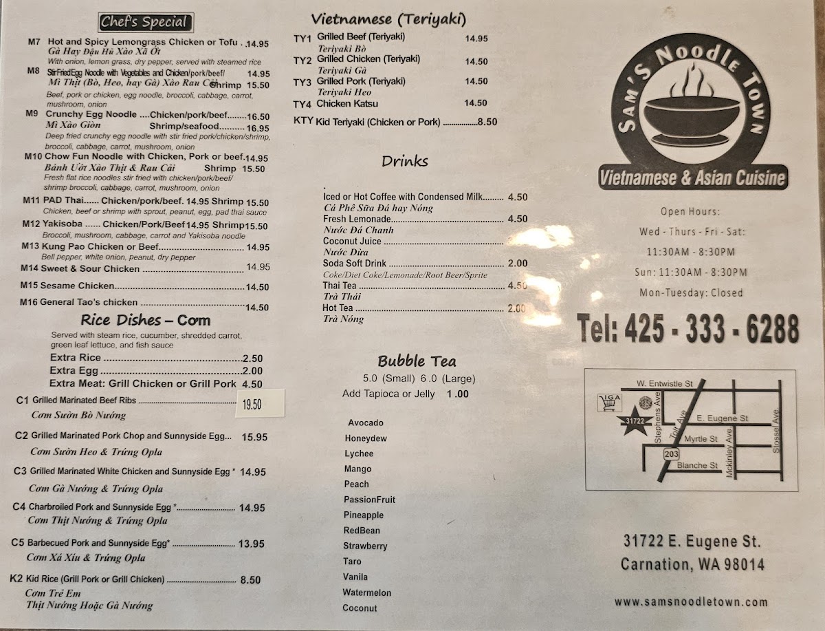Sam's Noodle Town offers a menu that blends casual Vietnamese favorites with familiar comfort dishes, creating a welcoming spot for anytime dining. Whether you're stopping by for a warming bowl of pho on a crisp afternoon or sharing fresh spring rolls and honey walnut prawns with friends, the food complements the relaxed, friendly atmosphere of the restaurant.