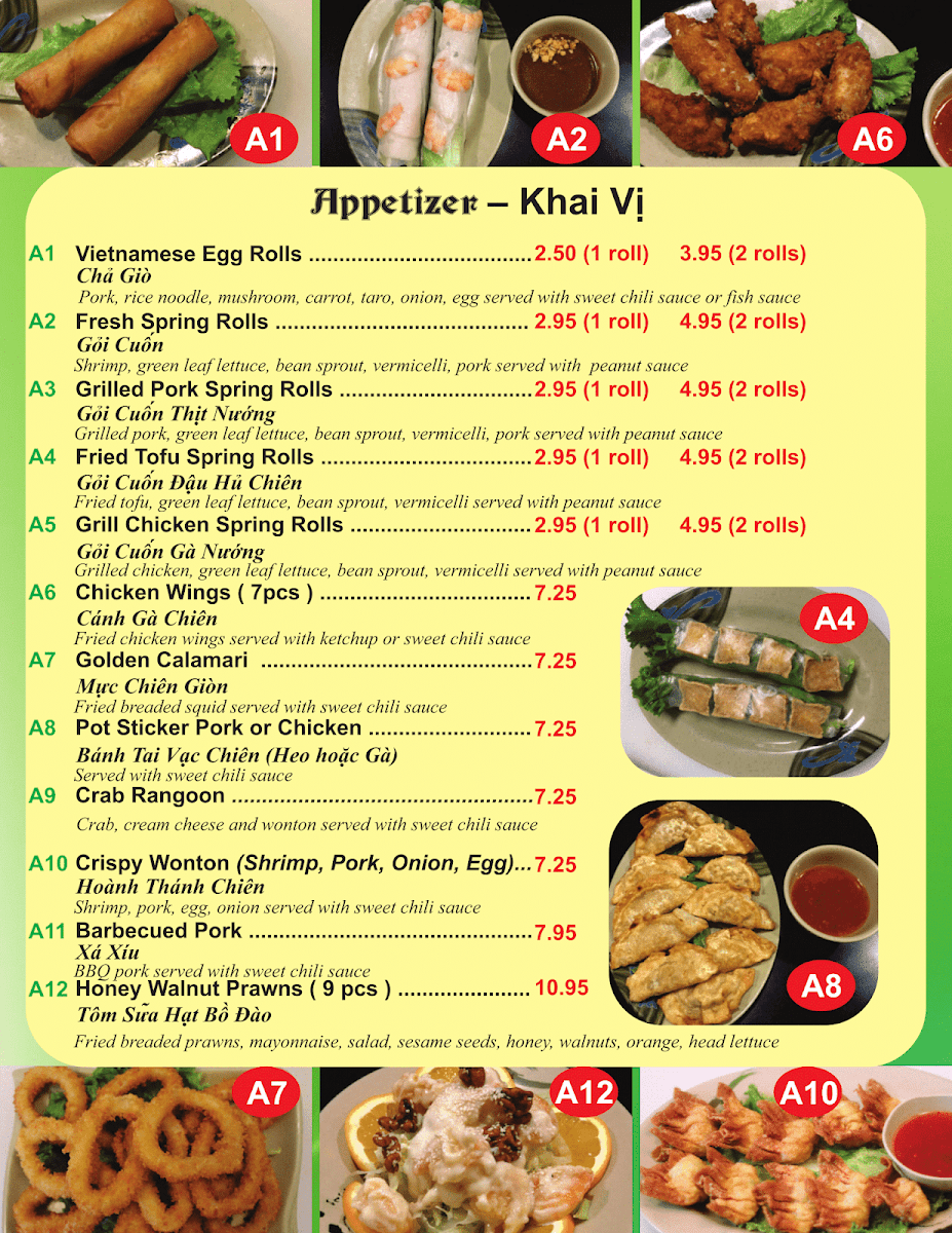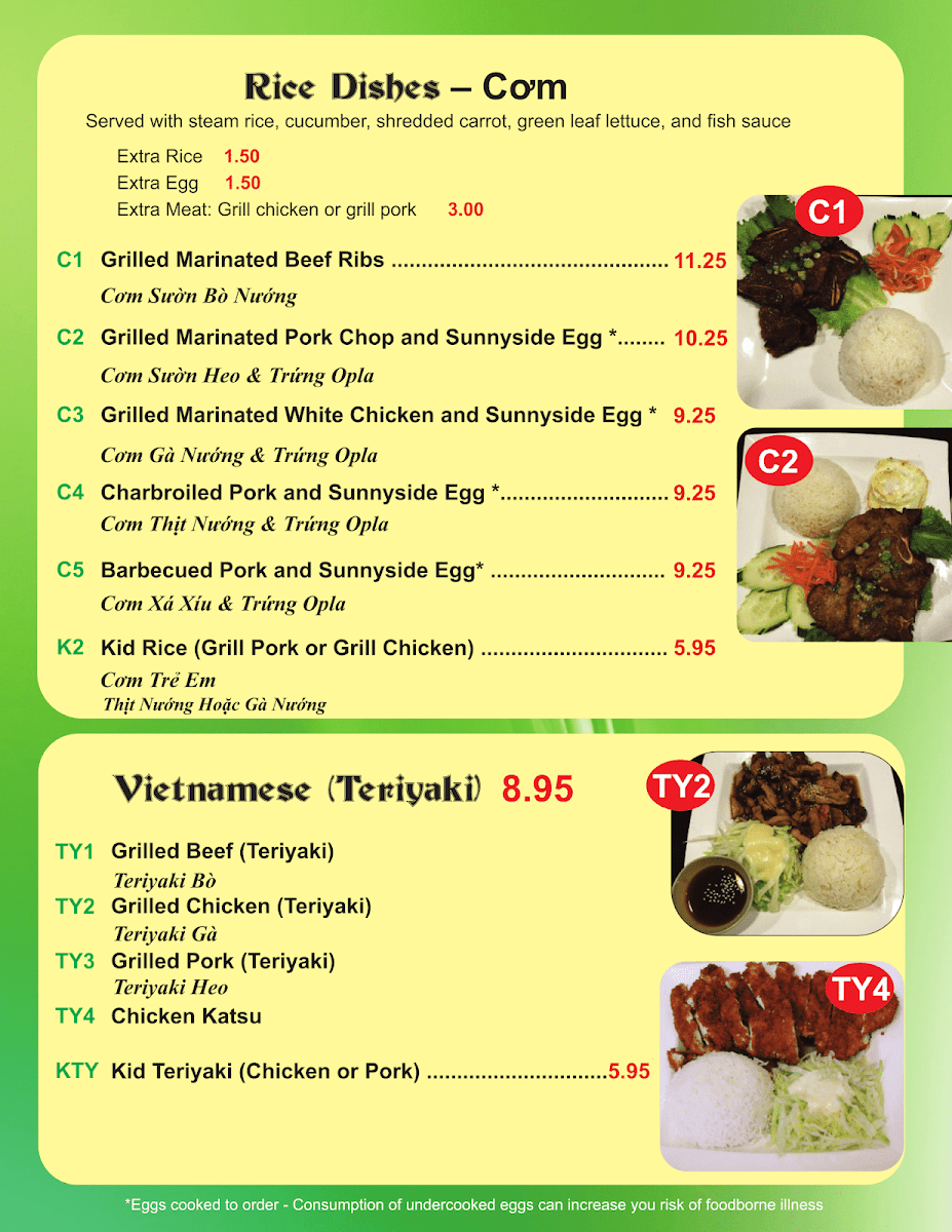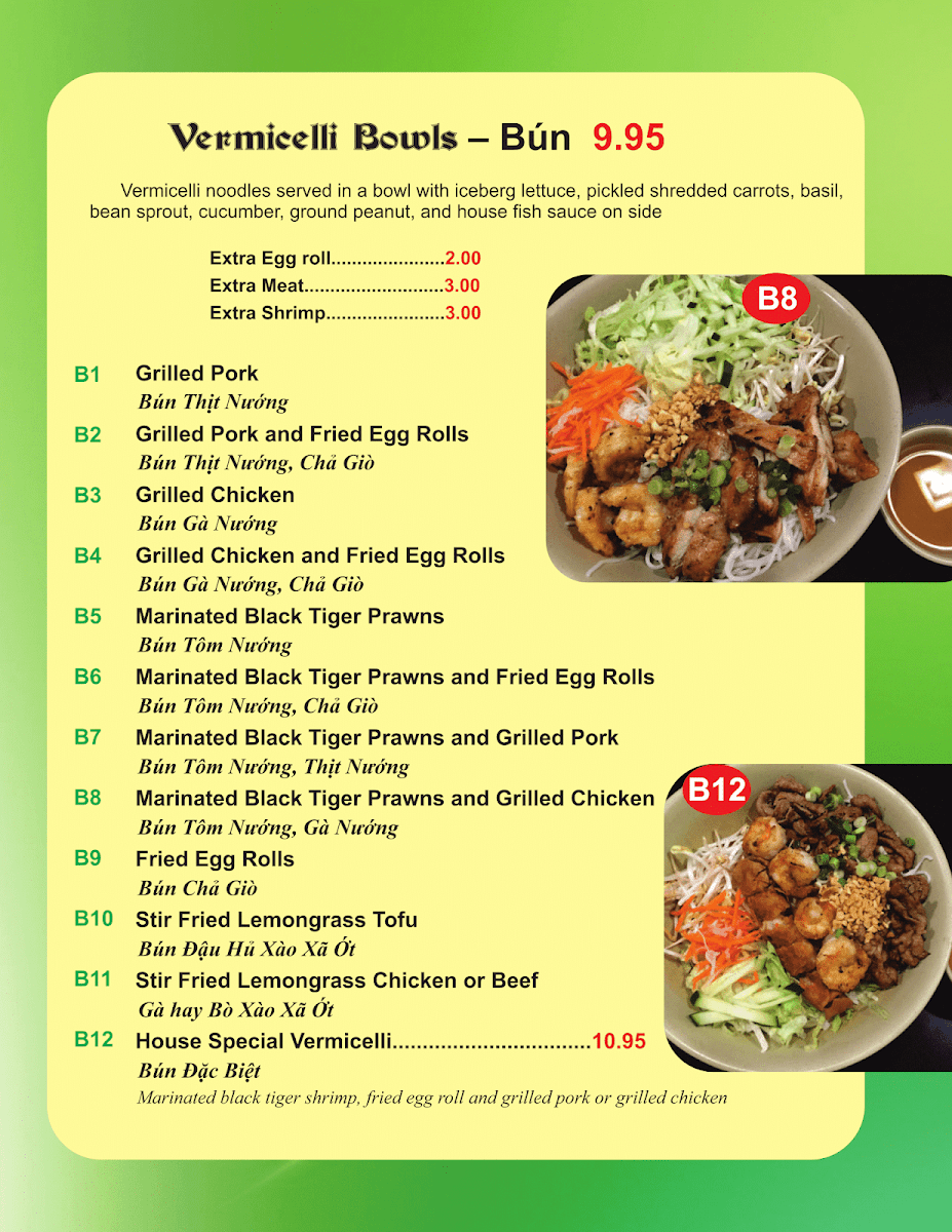 The menu features a variety of well-loved options such as pho, flavorful vermicelli bowls with choices like tiger prawns or grilled pork, and a selection of fried rice and noodle dishes. Light bites like crab rangoon and crunchy egg noodles provide approachable snacks or sides, while heartier plates like marinated beef short ribs and spicy lemongrass chicken bring satisfying depth for a fuller meal.